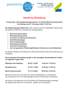 Einladung zum Vortrag “Nachhaltige Energiesysteme” am Montag, den 27. November 2023 um 19:00 Uhr im Dorfhof Markt Hartmannsdorf zu den Schwerpunkten: