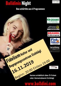 Balldinis Night – ein Programm für all jene, die Balldini noch nie gesehen haben, sie immer schon sehen wollten oder sie schon kennen und nicht genug von ihr bekommen können. Für Frauen wie Männer, für Ehepartnerinnen wie Singles, für Schwiegertöchter und Liebhaberinnen – ein Pflichtprogramm für alle, die die Hoffnung noch nicht aufgegeben haben.