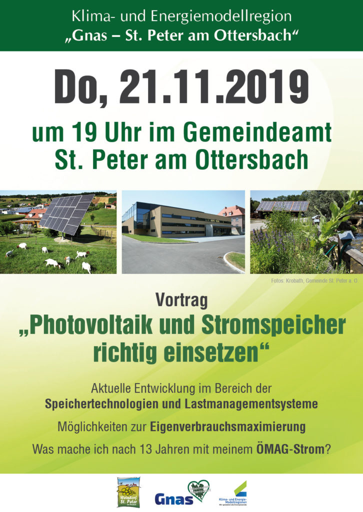 Am Do, 21. November 2019 um 19 Uhr findet im Gemeindeamt St. Peter am Ottersbach ein Vortrag zum Thema „Photovoltaik und Stromspeicher“ statt. Jeder kann sich darüber informieren, wann eine PV-Anlage mit/ohne Speicher sinnvoll ist, worauf bei der Planung zu achten ist, welche Produkte am Markt verfügbar sind und welche Förderungen beantragt werden können.