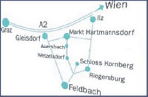 Schloss Kornberg liegt in der Süd-Oststeiermark und ist am besten über die Autobahn A2 (Abfahrt Ilz - Exit 138) über die B65 (bis Ilz) und B66 (über Walkersdorf) zu erreichen.