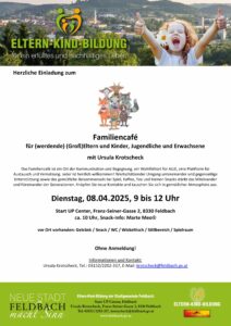 Das Familiencafé ist ein Ort der Kommunikation und Begegnung, ein Wohlfühlort für ALLE, eine Plattform für Austausch und Vernetzung. Jeder ist herzlich willkommen! Wertschätzender Umgang untereinander und gegenseitige Unterstützung sowie das gemütliche Beisammensein bei Spiel, Kaffee, Tee und kleinen Snacks stärkt das Miteinander und Füreinander der Generationen. Knüpfen Sie neue Kontakte und tauschen Sie sich in gemütlicher Atmosphäre aus.