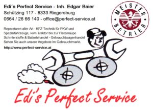 Vulkanland | Betriebe | Edi´s Perfect Service Edi´s Perfect Service Zurück zur Übersicht Edi´s Perfect Service Edgar Baier Schützing 117 Riegersburg Email schreiben Bilder Werkstätten 2 Rad Laller GmbH A1 Tankstelle Erich Fortmüller AG-Tech e.U. Kfz-Service u.Handel Agrarunion Südost Lagerhaus und Werkstätte ARBÖ-Auto-, Motor- und Radfahrerbund Österreichs, Prüfstelle Feldbach