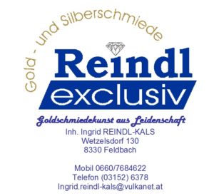 Ingrid Reindl-Kals ist bereits in der fünften Genaration in der Schmuckbranche tätig. Sie und ihre Familie feierten 2006 das 150 jährige Firmenjubiläum. Schon ewig gehört das Fachgeschäft Reindl zum Branchenmix der Feldbacher Innenstadt. Im März 2014 entschloss sich Ingrid Reindl-Kals dieses Geschäft zu schließen. Nunmehr geht die gelernte Goldschmiedin in ihrem Atelier in Wetzelsdorf 130, 8330 Feldbach, ihrer großen Leidenschaft nach. Als Goldschmiedin mit Herz und Seele, entwirft und fertigt sie einzigartige Schmuckstücke an, in welche auch immer wieder die Geschichte des Trägers eingearbeitet wird. Nicht ohne Grund wurde von Ingrid Reindl-Kals der Wortlaut