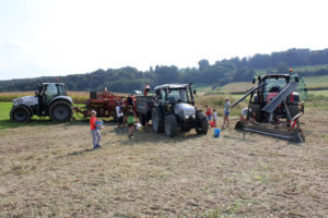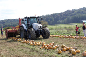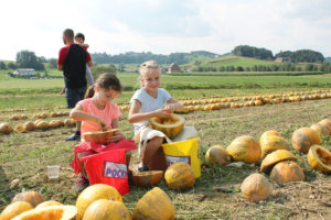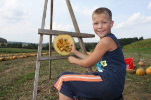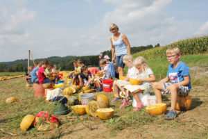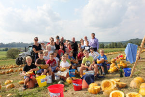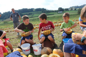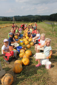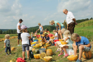 Unter anderem in der Gemeinde Kapfenstein bei Familie Gaber, wo die Kinder unter dem Thema „Kürbis-Ernte Früher & Heute“ tatkräftig beim „Kürbisputzen“ mithelfen durften.