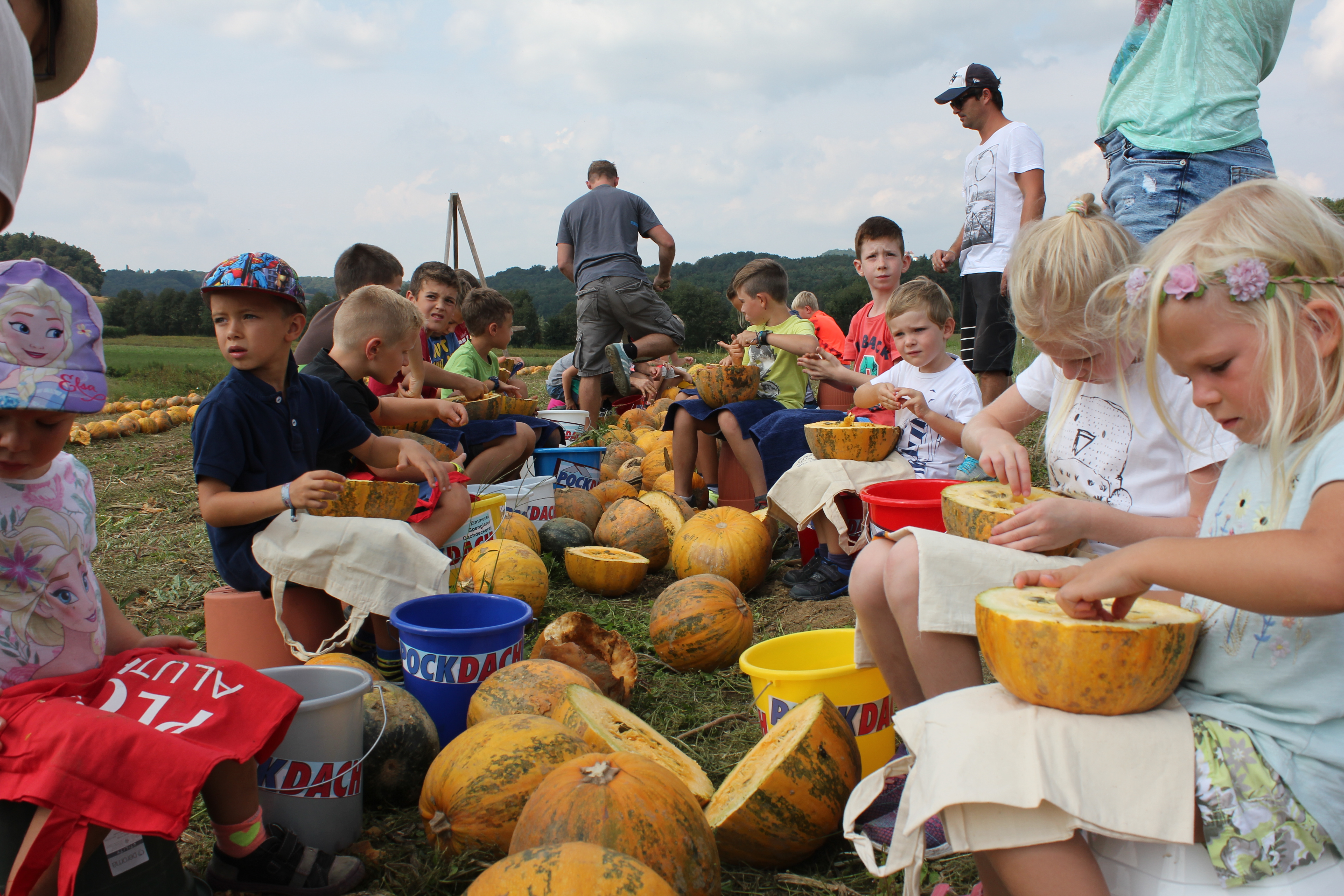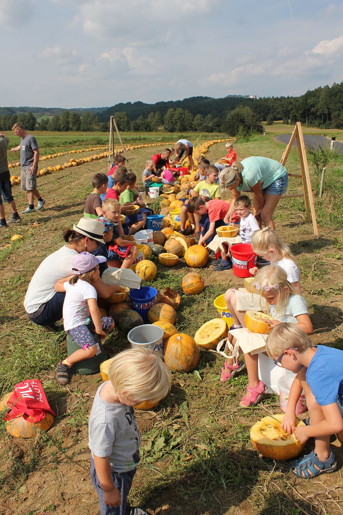 Unter anderem in der Gemeinde Kapfenstein bei Familie Gaber, wo die Kinder unter dem Thema „Kürbis-Ernte Früher & Heute“ tatkräftig beim „Kürbisputzen“ mithelfen durften.
