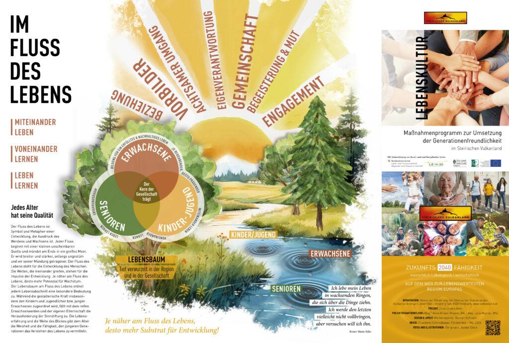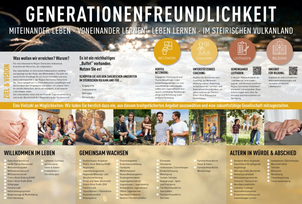 Ein neuer Folder stellt das lokale Angebot für alle Generationen in den Fokus und soll auch ein Appell zum Mitgestalten sein. Diese Sammlung von Initiativen, die es allesamt bereits in unterschiedlicher Ausprägung in Gemeinden des Steirischen Vulkanlands gibt, tragen dazu bei, dass Miteinander von Jung und Alt nachhaltig zu stärken, generationenübergreifende Begegnungen zu fördern und die Lebensqualität für alle Generationen zu erhöhen.