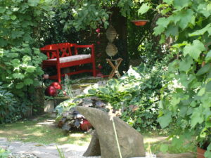 Zu einem weiteren Hobby zählt für mich auch die Literatur. Daher entstehen in meinen Garten immer wieder Ruheräume um dort in die Welt eines Buches eintauchen zu können. Einer meiner Favoriten ist mein Lesekasten, kein Bücherkasten, sondern ein Ort, in den man sich im Schatten eines Nussbaumes zurückziehen kann. Unweit davon ist ein weiteres Hobby von mir ersichtlich, der Bienenstand. Der Biene, eines unserer nützlichsten Insekten, sollte jeder Gärtner mehr Beachtung schenken. Der von mir geschleuderte Honig ist somit auch eine Ernte aus meinem Garten.