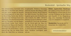 “Ort der Spirituellen Einkehr” am Loiberg, genau an der Grenze zwischen Breitenfeld und Riegersburg, liegt quasi an einem Kreuzungspunkt, an welchem der Pilgerweg “Spirituelles Dach der Vulkane”, weiters der “Riegersburgweg”, der Weitwanderweg 07, der Söchauerweg und schlussendlich auch der Rundwanderweg “Salvator-Mundi” (ausgehend von der Wallfahrtskirche zum “Heiland der Welt” in Breitenfeld) kreuzen.