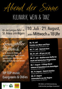 Abend der Sinne – dies bedeutet Kulinarik, Wein & Tanz an der Langen Tafel in St. Anna am Aigen. Lassen Sie sich verwöhnen von den verschiedensten Wirte bei den verschiedensten Themenabenden. Um Tischreservierung wird gebeten.