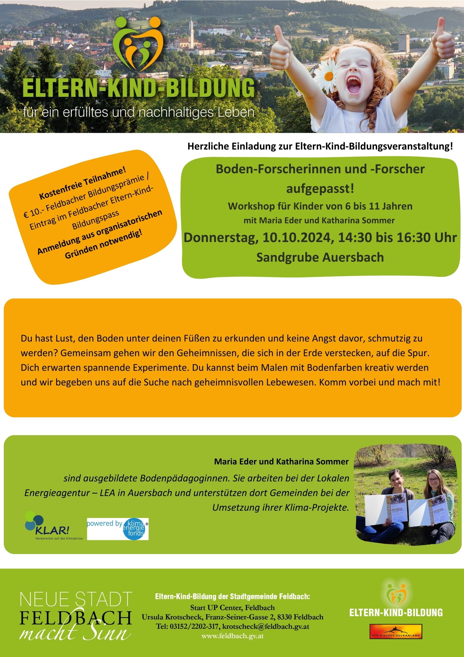 Du hast Lust, den Boden unter deinen Füßen zu erkunden und keine Angst davor, schmutzig zu werden? Gemeinsam gehen wir den Geheimnissen, die sich in der Erde verstecken, auf die Spur. Dich erwarten spannende Experimente. Du kannst beim Malen mit Bodenfarben kreativ werden und wir begeben uns auf die Suche nach geheimnisvollen Lebewesen. Komm vorbei und mach mit!