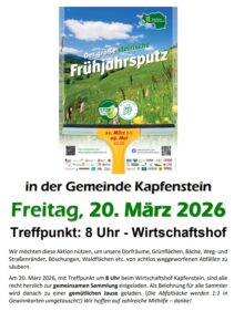 Wir wollen diese Aktion nützen und am Freitag, den 20. März 2026 unsere Dorfräume, Grünflächen, Bäche, Weg- und Straßenränder, Böschungen, Waldflächen etc. von achtlos weggeworfenen Abfällen säubern.