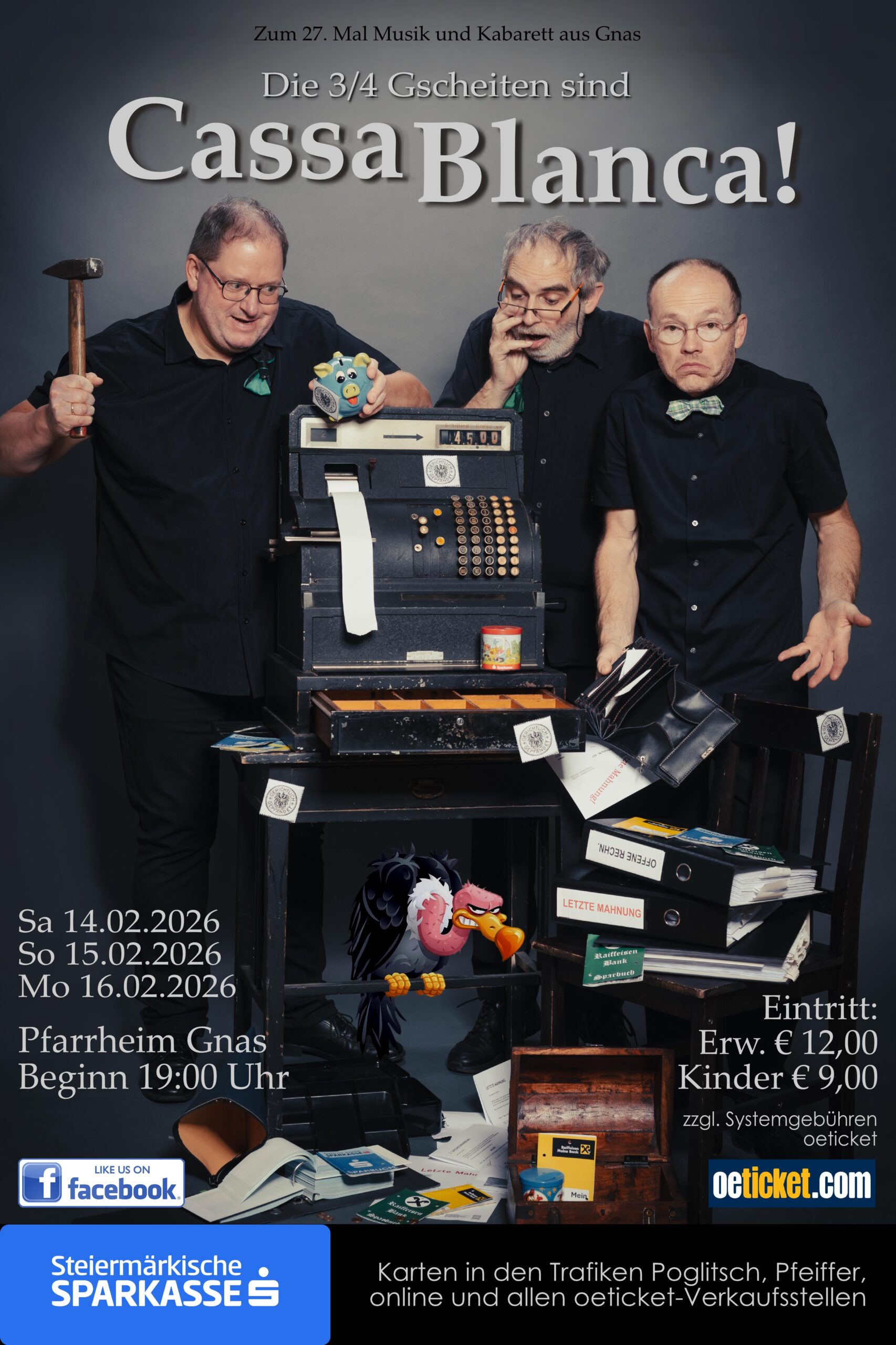 Home | Veranstaltungen | Die 3/4 Gscheiten sind Cassa Blanca! Die 3/4 Gscheiten sind Cassa Blanca! Zurück zur Übersicht Veranstaltung 14.02.2026ab 19:00 Pfarrheim Gnas Gemeinde Gnas Kultur, Kunst+Kultur+Theater, Wohin Vorlesestunde 20-jähriges Firmenjubiläum Hermann Rosenberger GmbH Musical des BRG/BORG Feldbach Gemeindeschitag Sinabelkirchen 2026 Kirtag