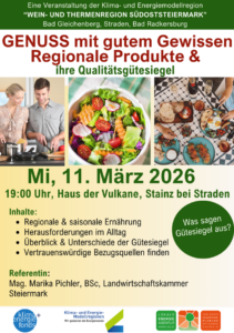 Die Klima- und Energiemodellregion Wein- und Thermenregion Südoststeiermark lädt Sie zu einem informativen Abend rund um die Themen bewusster Konsum und regionale Qualität ein.