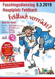 Feldbach spielt von Faschingssamstag bis Faschingsdienstag verrückt und wird alljährlich zum unvergesslichen Highlight. Darüber hinaus lässt sich das Tanzbein bei Faschingsbällen schwingen oder man kann sich bei Faschingssitzungen "schief lachen". Der Höhepunkt des Faschings beginnt am Faschingsdienstag mit dem "Halli-Galli" Kinderprogramm am Hauptplatz und endet mit dem großen Faschingsumzug mit rd. 20 bis 25 teilnehmenden Gruppen und Wägen. Es tut gut, die fünfte Jahreszeit ausgelassen, fröhlich und etwas verrückt zu verbringen. Und alle sind dabei: die Bevölkerung, Gäste, Kindergärten und Schulen, öffentliche Einrichtungen, Vereine und die Wirtschaft.