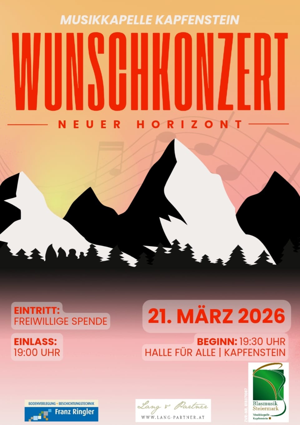 Home | Veranstaltungen | Frühlingswunschkonzert – Musikkapelle Kapfenstein Frühlingswunschkonzert – Musikkapelle Kapfenstein Zurück zur Übersicht Veranstaltung 21.03.2026 Halle für Alle Gemeinde Kapfenstein Bilder Konzerte, Chöre, Singkreise MMuSi-Konzert Liederabend mit Peter Panhofer Konzert MoZuluArt Konzert der Musikschule Gleisdorf, Zweigstelle Sinabelkirchen Bandabend am See