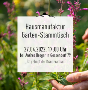 Die Hausmanufaktur-Gärtnerinnen laden zur Garten-Stammtisch-Runde ein. Andrea Bregar startet mit dem ersten Stammtisch-Termin zum Thema Kräuterbeete "So gelingt der Kräuteranbau" am Mittwoch, 27.04.2022 um 17:00 Uhr in Gossendorf 79. Bei einer Gartenrunde auf Andrea Bregar's Hof gibt es Platz für Austausch zu Fragen und Ideen rund um den Anbau, die Pflege, die Ernte und die Verarbeitung von Kräutern.
