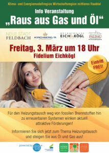 Für den Heizungstausch weg von fossilen Brennstoffen hin zu erneuerbaren Systemen winken aktuell attraktive Förderungen! Im Rahmen der Infoveranstaltung erfahren Sie, welche Heizung zu Ihrem Gebäude passt und welche Förderungen aktuell zur Verfügung stehen. Informieren Sie sich zum Thema Heizungstausch und steigen Sie aus Öl und Gas aus!