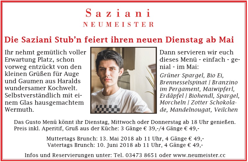 Weitere Informationen & Reservierung unter 03473 / 8651 oder saziani@neumsiter.cc