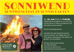 Schon Tradition hat die Sonnwendfeier "Sonniwend" in Sonnis Garten. Die Sonnis, Christa und Werner Sonnleitner, öffnen an diesem Tag ihren zauberhaften Garten. Ein riesiger Park mit vielen Dingen zum Entdecken und Staunen: Teich, Bach, Baumhaus, alte Grabkreuze, viele Gartenskulpturen, Sitzplätze, Gartenbibliothek, Glashaus, usw.