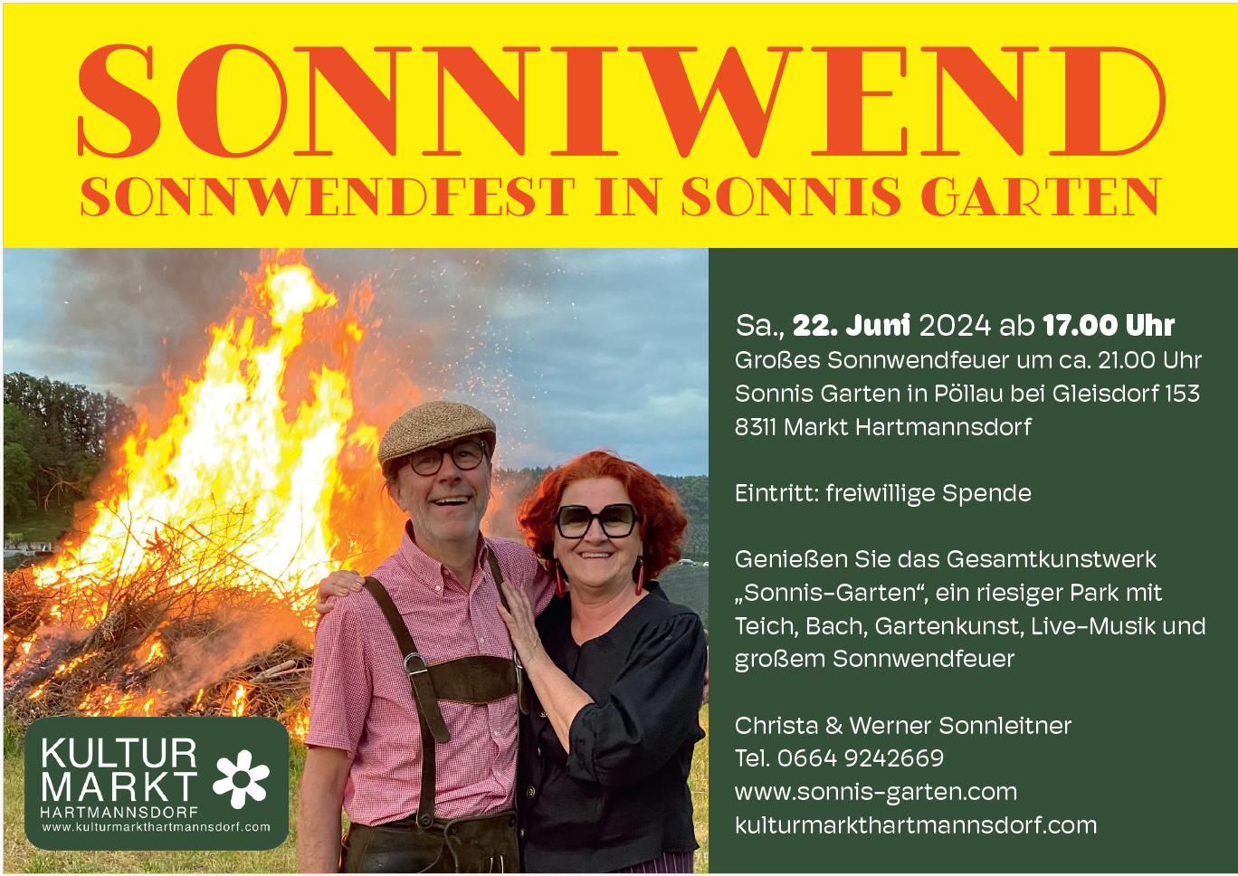 Schon Tradition hat die Sonnwendfeier "Sonniwend" in Sonnis Garten. Die Sonnis, Christa und Werner Sonnleitner, öffnen an diesem Tag ihren zauberhaften Garten. Ein riesiger Park mit vielen Dingen zum Entdecken und Staunen: Teich, Bach, Baumhaus, alte Grabkreuze, viele Gartenskulpturen, Sitzplätze, Gartenbibliothek, Glashaus, usw.