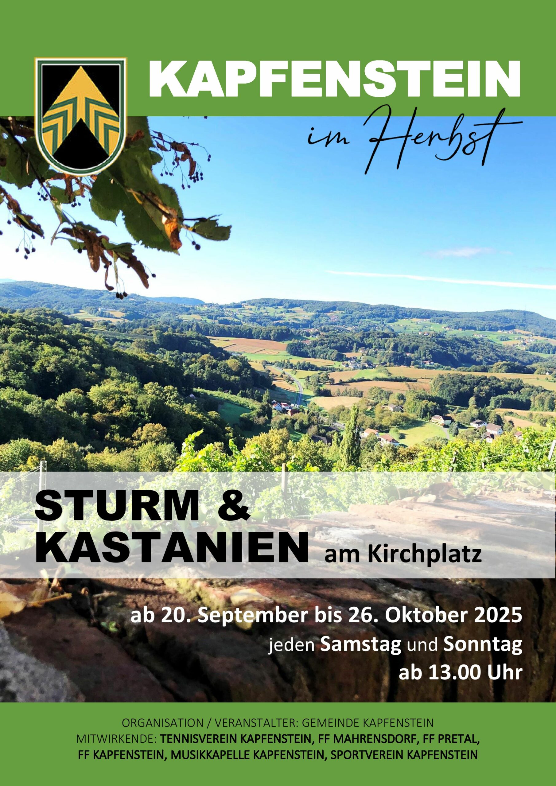 Sturm u. Kastanien am Kirchplatz ab 20. September bis 26. Oktober 2025 jeden Samstag und Sonntag ab 13.00 Uhr